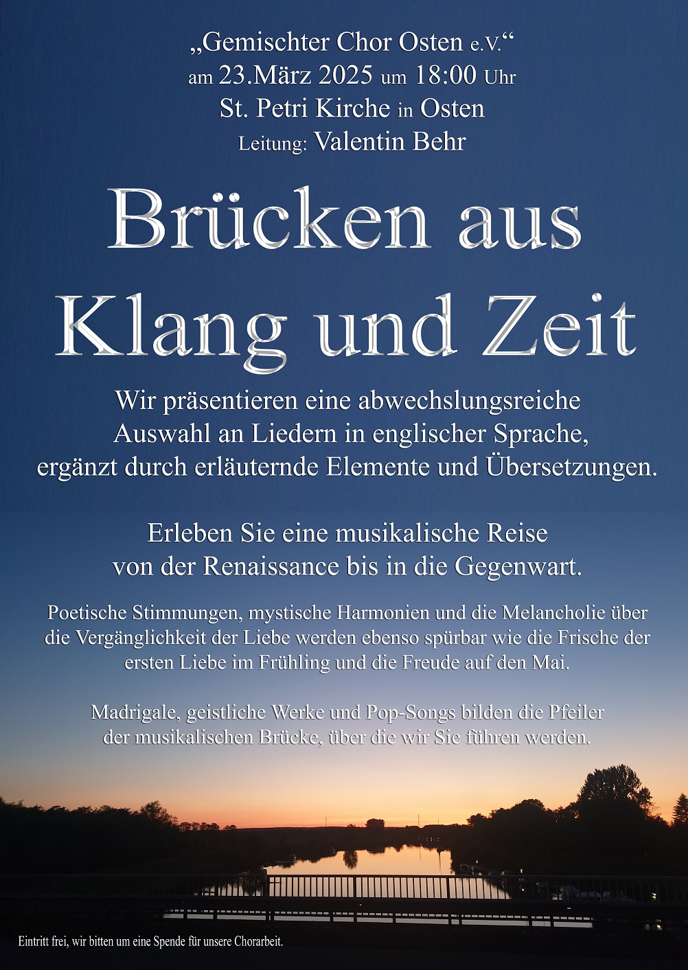 | Unsere Probenzeiten: Dienstag von 19:30 - 21:30 im Gemeindehaus Fährstraße 9, 21756 Osten |